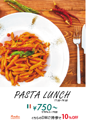 40代主婦を対象に、パスタの写真とカジュアル寄りの筆記体…